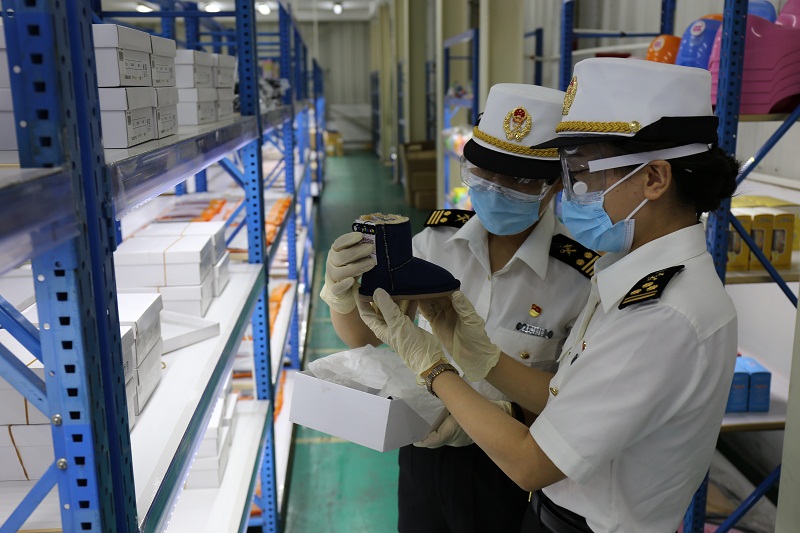 图为:关员正在对跨境电商体验店在库商品进行现场监管 褚晓/摄
